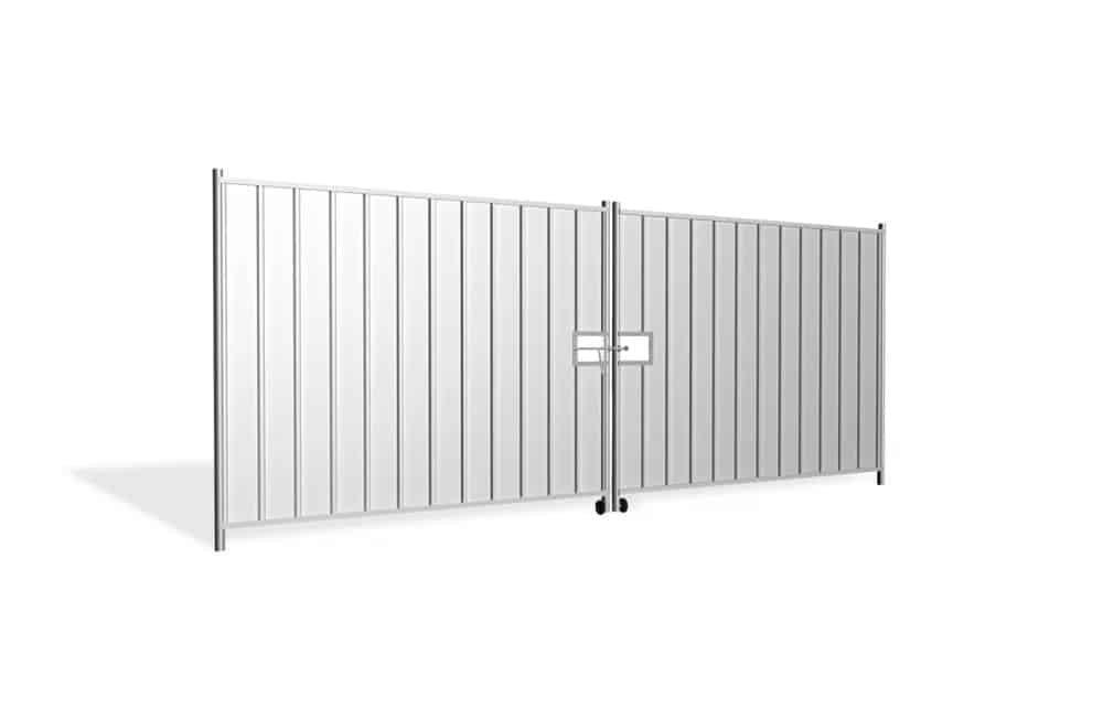 Dvokrilna polna gradbiščna vrata za prehod vozil (2 x 2,3 m) so dopolnilni element sistema mobilnih gradbiščnih ograj, ki omogoča enostaven in udoben vstop na gradbišče brez potrebe po demontaži ograje.