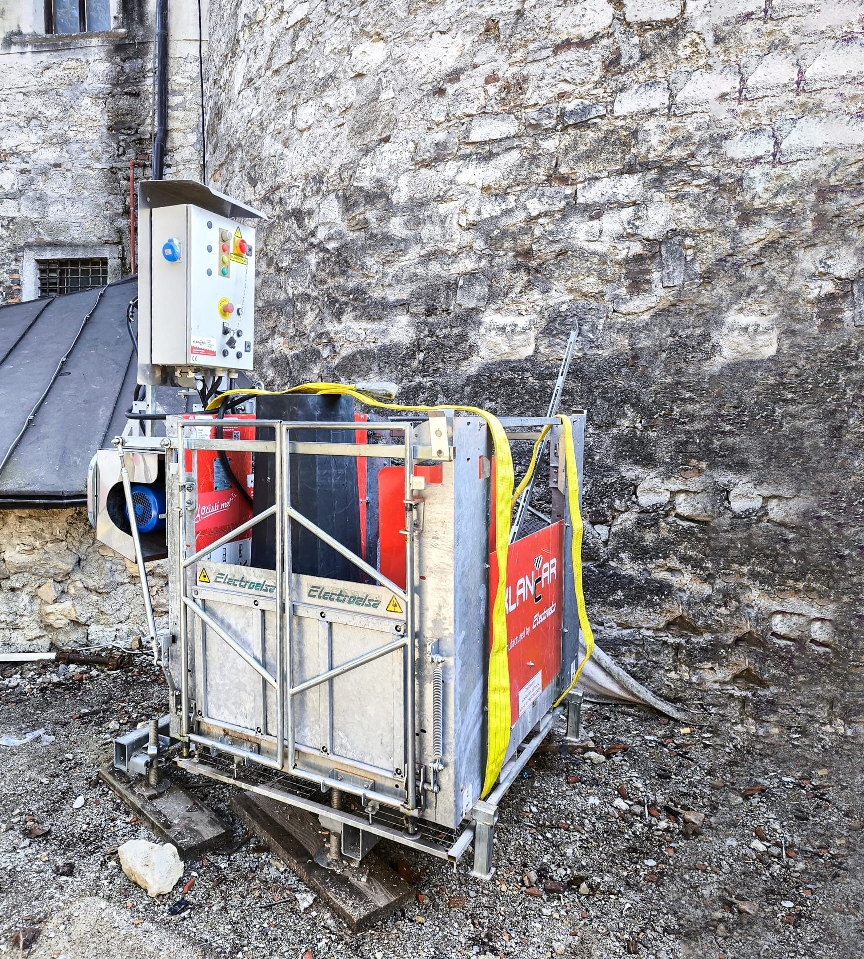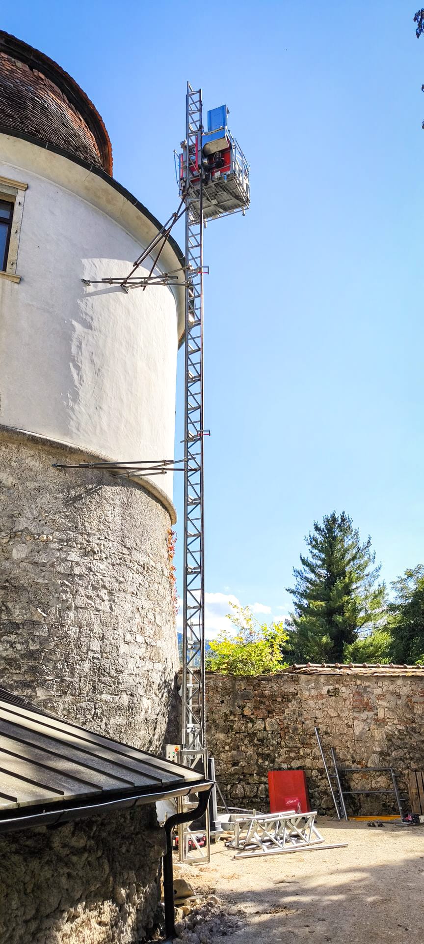Zaradi varnosti in učinkovitosti smo uporabili dvigalo višine 20 metrov, kar omogoča varen dostop do vseh nadstropij obnovitvenih del, brez nepotrebnega poseganja v strukturo gradu.