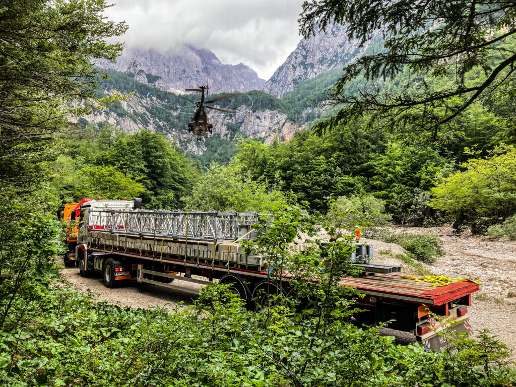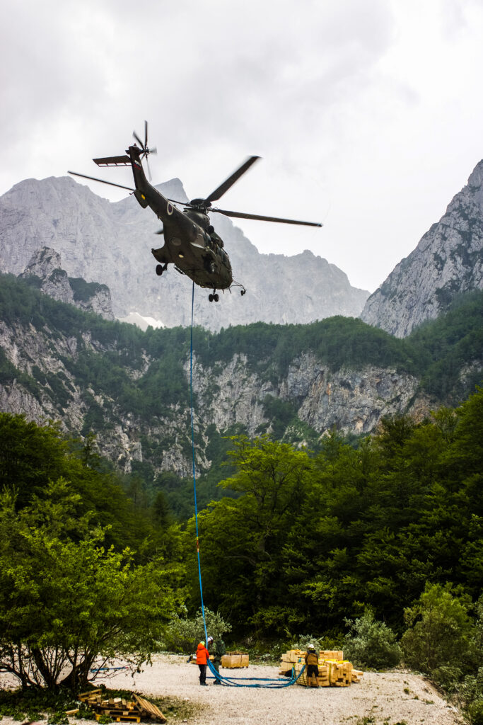 Do gradbišča je dostop omejen – osebje lahko pride le peš, material pa običajno s tovorno žičnico. Za žerjav to ni bilo izvedljivo, zato je bil edini način dostave transport s helikopterjem Slovenske vojske.