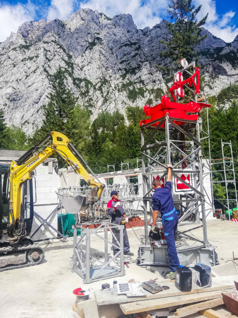 • Ekipa štirih monterjev je v treh dneh žerjav uspešno sestavila, tako da je stal na robu betonske plošče nad Logarsko dolino.