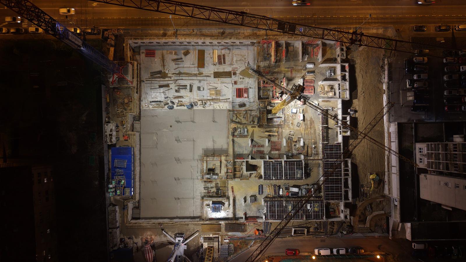 Na gradbišču trenutno delujejo trije stolpni žerjavi, ki pokrivajo vse faze gradnje. Višina objekta in arhitekturna kompleksnost zahtevata povečane delovne višine ter dodatne varnostne ukrepe.
